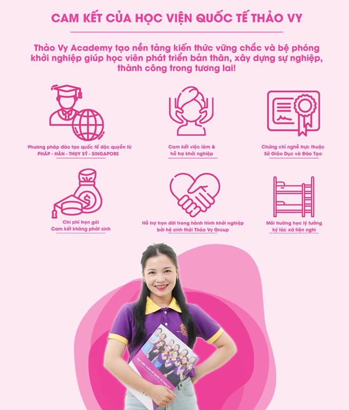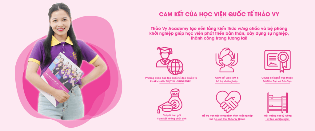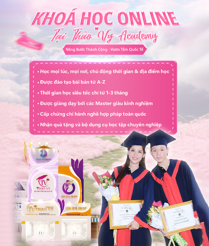 Học Viện Thẩm Mỹ Quốc Tế Thảo Vy là đơn vị đào tạo nghề chính quy trực thuộc Sở Giáo dục, cung cấp các chương trình học nghề thẩm mỹ theo chuẩn quốc tế. Với phương pháp đào tạo 90% thực hành trên mẫu thật, cùng đội ngũ giảng viên giàu kinh nghiệm giúp học viên nắm vững kỹ năng chuyên môn ngay trong quá trình học tập. Đặc biệt, Thảo Vy cam kết 100% cơ hội việc làm sau tốt nghiệp, đồng hành cùng học viên trên con đường xây dựng sự nghiệp vững chắc trong ngành làm đẹp.